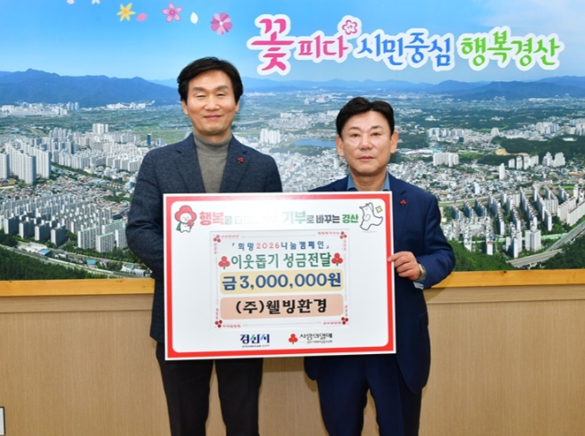 [경북도민방송=이종환 기자]경산시는 ㈜웰빙환경(대표이사 박상희)이 12월 19일 이웃돕기 성금 및 인재 육성을 위한 장학금 총 500만 원을 기탁했다고 밝혔다.(주)웰빙환경은 경산시에 소재한 폐기물 처리 분야 전문기업으로, 약 20년간 경산시 생활폐기물 수집·운반 대행업무를 수행하며 깨끗하고 쾌적한 도시환경 조성에 기여해 왔으며, 매년 지역사회와의 상생을 위해 다양한 사회공헌 활동도 지속적으로 펼치고 있다.박상희 대표이사는 “지역사회로부터 받은 사랑을 다시 환원하고자 성금과 장학금을 기탁하게 됐다”며, “작은 마음이지만 어려운 이웃과 미래 인재들에게 도움이 되기를 바란다”고 말했다.조현일 시장은 “어려운 경기임에도 불구하고 지역사회를 위해 꾸준한 나눔을 실천해 주신 ㈜웰빙환경에 깊이 감사드린다”며, “기탁해 주신 성금과 장학금은 도움이 필요한 이웃과 지역 인재 육성을 위해 투명하고 뜻깊게 사용될 수 있도록 최선을 다하겠다”고 말했다.