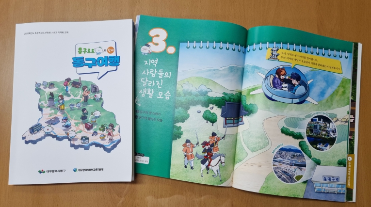 [경북도민방송=손중모 기자]대구 동구의 지리와 역사, 명소 등을 담은 지역화 교재가 이달 발간된다.대구 동구청은 지난 3월부터 개발에 착수한 초등 사회과 지역화 교재 ‘동구르르와 함께 동구여행’의 집필과 편집 과정을 마무리하고 최종 발간을 앞두고 있다고 22일 밝혔다.이번 교재는 동부교육지원청 장학사, 현직 교사 등으로 구성된 교재 개발위원회를 통해 제작됐으며, 2022년 개정 사회과 교육과정을 반영해 지역 연계 학습에 최적화된 내용을 담고 있다. 교재는 △제1장 동구 살펴보기 △제2장 우리가 사는 살기 좋은 곳 △제3장 지역 사람들의 달라진 생활 모습 △제4장 우리 지역의 국가유산으로 구성돼 초등학교 3~4학년 사회과 단원과 연계해 학습할 수 있도록 편성됐다.특히, 동구 SNS캐릭터인 ‘동구르르’를 교재 전반에 활용해 흥미와 친근감을 높였으며, 행정동별 지도와 학교 주변 장소를 영상 지도로 확인할 수 있는 학교별 QR코드 삽입으로 수업 활동에 학생들의 능동적인 참여를 유도했다.동구청은 학교별 수요조사를 거쳐 2026학년도 시작 전 관내 초등학교 33개교에 교재를 배부할 계획이며, 사회과목 부교재로 수업에서 활용될 예정이다.윤석준 동구청장은 “지역화 교재를 통해 학생들이 동구의 생활환경, 역사와 문화를 탐구하며 지역에 대한 자긍심과 애착심을 키우는 계기가 되길 바란다”며 “앞으로도 지역자원을 교육과정과 연계해 아이들이 지역을 배우며 세계를 이해하는 인재로 성장할 수 있도록 적극 지원하겠다”고 말했다.