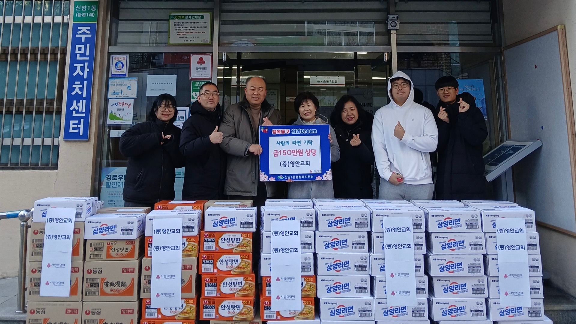[경북도민방송=손중모기자] 대구 동구 신암1동 소재 대구영안교회는 지난 26일 지역사회의 어려운 이웃에게 전달해 달라며 신암1동행정복지센터에 라면 100상자(약 150만 원 상당)를 기탁했다.이번 기탁은 연말을 맞아 취약계층이 보다 따뜻한 겨울을 보낼 수 있도록 돕기 위해 교회 성도들의 자발적인 참여로 마련됐다.김치성 담임목사는 “연말을 맞아 어려운 이웃들이 따뜻한 겨울을 보내는 데 조금이나마 도움이 되기를 바라는 마음에서 성도들의 정성을 모아 라면을 기탁하게 됐다”고 말했다.이에 김영옥 신암1동장은 “어려운 이웃을 위해 매번 따뜻한 나눔을 실천해 주셔서 깊이 감사드린다”며 “기탁해 주신 라면은 도움이 필요한 이웃들에게 소중히 잘 전달하겠다”고 감사의 뜻을 전했다.한편 대구영안교회는 매년 다양한 나눔 활동을 통해 지역사회에 온기를 전하며 이웃사랑 실천에 앞장서고 있다.