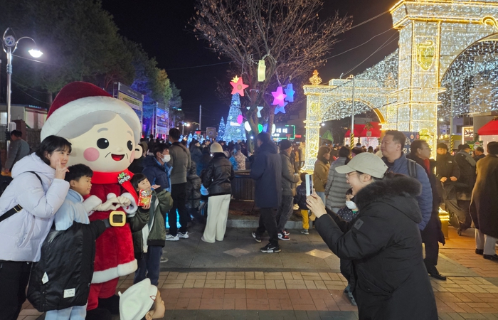 [경북도민방송=한동균 기자]칠곡군의 겨울밤이 따뜻한 온기와 웃음으로 가득찼다. 칠곡군의 신규 관광콘텐츠로 왜관역 광장에서 첫선을 보인‘2025 럭키칠곡 크리스마스 마켓’이 12월 6일부터 12월 25일까지 총 5회 운영되며 약 13,000명의 관람객이 방문하는 성과를 거두고 성황리에 마무리 됐다. 겨울철 대표 축제가 부족했던 지역에서 올해 처음 개최된 이번 크리스마스 마켓은 행사장을 찾은 가족, 연인 등 다양한 방문객들에게 다채로운 볼거리와 즐길거리를 제공하며 큰 호응을 이끌었다.우선 역 광장을 하나의 겨울 정원으로 꾸민‘화이트 트리숲’이 가장 큰 주목을 받았다. 8m 높이의 대형 트리와 하얀 조형물이 어우러진 야간경관은 이색적인 SNS 인증샷으로 행사기간 내내 방문객들의 발길이 끊이지 않았으며 연말 분위기를 한층 고조시켰다.야간경관은 크리스마스 마켓 종료 이후에도 내년 1월 말까지 운영되어 겨울철 칠곡군을 찾는 관광객들에게 지속적인 볼거리와 휴식 공간을 제공할 예정이다. 또한 행사의 메인 프로그램으로 지역 소상공인이 참여하고 각종 크리스마스 장식으로 예쁘게 꾸며진 18여 개의 셀러 마켓은 크리스마스 소품, 수공예품, 농특산품, 겨울 간식 등 다양하고 개성있는 상품을 선보이며 방문객들이 줄을 이어 축제와 지역 상권을 잇는 장으로 운영됐다. 이번 행사에 참여한 마켓 셀러들은 “지역의 소상공인이 직접 참여해 의미가 있었고 행사장 구성이 예뻐서 관광객들의 호응이 좋아 매우 만족스러운 마켓이었다”고 긍정적인 소감을 밝혔다.또한 군밤 굽기, 소원등 달기, 캐리커쳐, 미니 트리 만들기, 케이크·쿠키 만들기 등 다양한 체험 프로그램은 첫날부터 가족단위 방문객의 이목을 집중시켰으며 특히 ‘칠곡할매’를 재미있게 캐릭터화하여 제작한‘칠곡 산타할매’탈인형은 인증샷과 함께한 이벤트로 어린이들을 동반한 가족단위 방문객에게 높은 인기를 끌었다.아울러 트리숲 앞에서 펼쳐진 다채로운 공연 프로그램도 축제의 볼거리를 더했다. 축제의 개막을 알리는 메인 트리 점등식 ‘캔들라이트 콘서트’부터 매회마다 마술, 마임, 코믹 퍼포먼스&버블쇼, 버스킹 등이 펼쳐지며 관광객들에게 재미와 웃음을 더했고 지역민(왜관제일교회, 왜관교회, 왜관성당, 국악앙상블)이 참여한 성가대, 국악 등 각종 공연도 크리스마스 분위기의 감동을 한층 고조시켰다.칠곡군 관계자는 “올해 처음 시도하는 겨울축제지만 많은 분들의 관심과 사랑 속에 성공리에 마무리됐다.”라며 “앞으로도 모두가 행복하고 따뜻한 연말연시가 될 수 있도록 내년에도 더욱 더 알차게 준비하여 칠곡의 대표 겨울축제로 발전시키겠다”고 말했다.