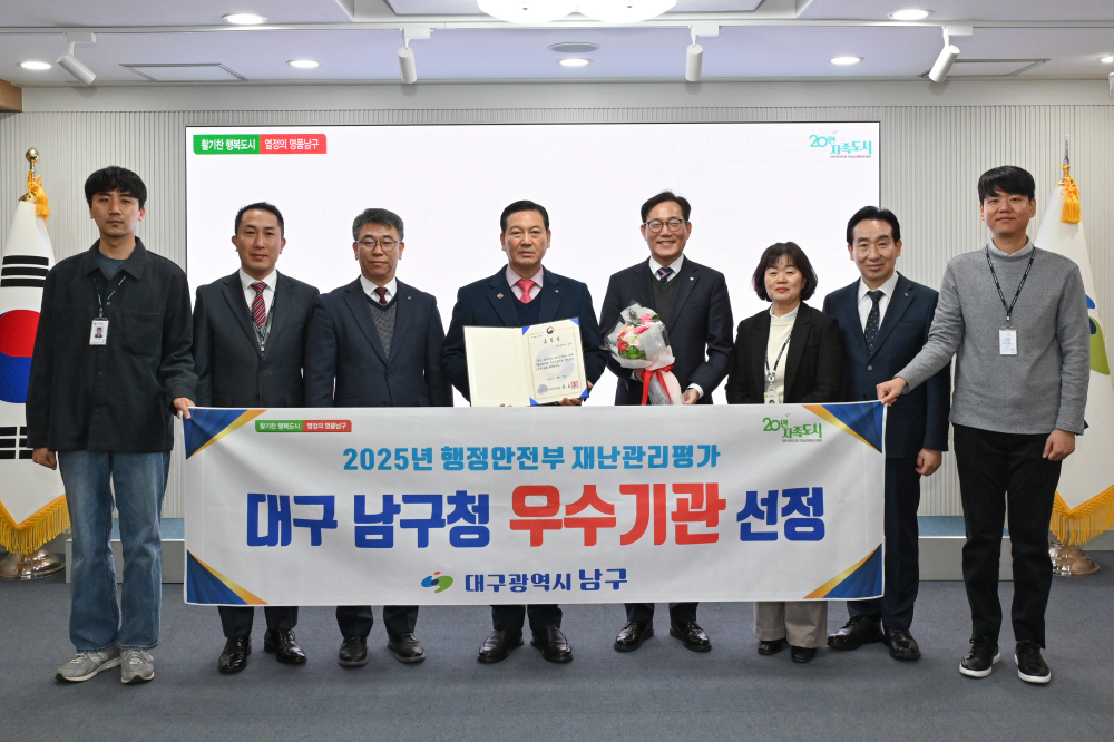 [경북도민방송=손중모기자]대구 남구청은 행정안전부가 주관한 ‘2025년도 재난관리평가’에서 우수기관으로 선정돼 장관 표창과 함께 특별교부세 13억 원, 포상금 400만 원을 지원받는다고 29일 밝혔다.재난관리평가는 ‘재난 및 안전관리 기본법’에 따라 중앙부처와 공공기관, 지방자치단체 등 전국 338개 기관을 대상으로 재난관리 역량을 진단하고, 기관별 책임성을 높이기 위해 매년 실시되고 있다.이번 평가는 중앙재난관리평가단이 참여해 재난관리 단계별 필수 업무 수행 여부와 재난 유형별 관리 활동 등 38개 지표를 중심으로 공정하고 객관적으로 이뤄졌다.평가 결과 남구는 재난관리기금 관리 실적을 비롯해 취약계층 안전관리 강화, 감염병 재난 저감 활동, 민간 다중이용시설 위기관리 실적 등 주요 지표에서 우수한 평가를 받은 것으로 나타났다.우수기관으로 선정된 남구는 행정안전부 장관 표창과 함께 특별교부세 13억 원, 포상금 400만 원 등 재정적 인센티브를 받게 된다.