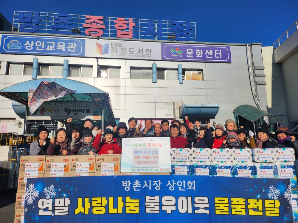 [경북도민방송=손중모기자]대구 동구 방촌시장상인회가 연말을 맞아 지역 내 소외계층을 위한 따뜻한 나눔에 나섰다.방촌시장상인회는 지난 26일 라면과 휴지 등 260만 원 상당의 생필품을 방촌동 행정복지센터에 기탁했다.이번에 전달된 물품은 연말연시 추운 겨울을 보내는 관내 저소득·취약계층을 돕기 위한 것으로, 총 50가구에 전달될 예정이다.