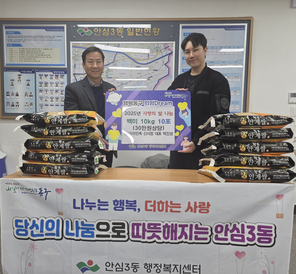 [경북도민방송=손중모기자] 대구 동구 마라민족 신서점이 지역 내 취약계층을 위한 이웃사랑 나눔에 동참했다.대구 동구 안심3동에 위치한 마라민족 신서점은 지난 26일 지역 내 어려운 이웃을 돕기 위해 백미 10kg 10포를 안심3동 행정복지센터에 기탁했다.이번에 전달된 백미는 홀로 생활하는 어르신과 저소득 취약계층 가정에 지원될 예정으로, 연말연시 따뜻한 온정을 전하는 계기가 될 것으로 기대된다.박진성 대표는 “멀리 계시는 할머니를 떠올리며 이웃과 정을 나누고자 하는 작은 마음으로 준비했다”며 “이번 나눔이 홀로 계시는 어르신들에게 조금이나마 힘이 되길 바란다”고 말했다.김진구 안심3동장은 “모두가 어려운 시기에도 지역사회를 위한 따뜻한 나눔을 실천해 주신 마라민족 신서점에 깊이 감사드린다”며 “기탁해 주신 백미는 도움이 필요한 취약계층 가정에 소중히 전달해 지역사회에 온기를 더하겠다”고 밝혔다.안심3동 행정복지센터는 앞으로도 민관 협력을 통해 복지 사각지대 해소와 이웃 돌봄 활동을 지속적으로 추진해 나갈 방침이다.