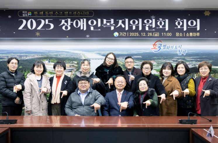 [경북도민방송=한동균 기자]칠곡군은 지난 26일 군청 소통마루에서‘2025년 장애인복지위원회 회의’를 개최했다.장애인복지위원회는 김재욱 칠곡군수(위원장)를 비롯해 장애인단체장과 장애인 복지 분야 전문가 등 11명으로 구성돼 있으며, 이날 회의에서는 2025년 장애인복지 주요 사업 추진 경과와 2026년 주요 사업 계획에 대한 보고가 이뤄졌다. 참석자들은 장애인 복지 정책의 실효성을 높이기 위한 다양한 의견을 공유하며, 향후 장애인 복지 발전 방향에 대해 심도 있는 논의를 나눴다.특히 회의 말미에는 칠곡군장애인단체연합회가 지역 내 어려운 이웃을 돕기 위해 성금 250만원을 기탁해 따뜻한 나눔의 의미를 더했다.칠곡군은 앞으로도 장애인이 지역사회에서 안정적으로 생활할 수 있도록 맞춤형 복지서비스 제공과 다양한 복지 사업을 지속적으로 확대해 나갈 계획이다.