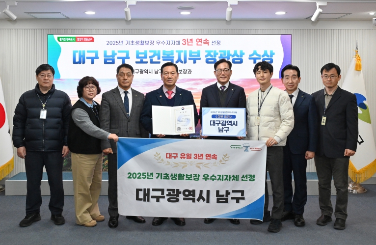 [경북도민방송=손중모 기자]대구 남구는 ‘2025년 기초생활보장분야 우수지자체 평가’에서 보건복지부장관 표창을 수상했다고 밝혔다. 대구 남구는 보건복지부가 전국 지방자치단체를 대상으로 실시한 기초생활보장 분야 평가에서 2023년, 2024년에 이어 2025년까지 3년 연속 우수지자체로 선정되는 성과를 거두었다. 이는 대구 지역에서 유일하게 3년 연속 수상이라는 점에서 더욱 의미가 크다. 조재구 남구청장은 “기초생활보장 분야 우수지자체로 선정되고, 대구에서 유일하게 3년 연속 수상의 성과를 거둘 수 있었던 것은 남구 주민들의 관심과 적극적인 참여, 그리고 현장에서 묵묵히 최선을 다한 공직자들의 노력이 함께 만들어 낸 결과”라며, “2026년 새해에도 도움이 필요한 저소득 사각지대 대상자를 선제적으로 발굴하여, 촘촘한 맞춤형 복지서비스 지원을 통해 기초생활보장 제도의 신뢰도를 더욱 높여, 주민의 삶에 실질적인 도움이 되는 복지행정을 실현해 나가겠다.”라고 말했다.
