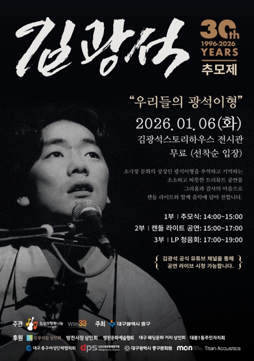 [경북도민방송=손중모 기자]대구 중구는 1월 6일 오후 2시 한국 대중음악사에 큰 발자취를 남긴 故 김광석의 30주기를 맞아 추모행사를 개최한다.이번 추모제는 김광석스토리하우스에서 열리며, 유튜브 생중계를 병행해 시민들과 함께하는 비대면 추모의 장으로 마련된다.행사는 오후 2시 추모식을 시작으로 오후 2시 30분부터 추모 공연이 이어진다. 공연에는 첼리스트 채송아, 기타리스트 겸 싱어송라이터 김성준, 소프라노 심규연 등이 참여해 김광석이 남긴 명곡들을 재해석한 추모의 무대를 선보일 예정이다. 이와 함께 김광석 30주기 추모 ‘김광석 노래 이야기 & 인생 이야기’ LP 연주가 진행돼 깊은 울림을 전한다.태성길 (사)김광석행복나눔 이사장은 “30주기를 맞아 화려한 무대보다 김광석의 노래가 지닌 위로와 온기를 담아내고자 했다”며 “그의 노래가 여전히 우리 곁에 살아 있음을 함께 느끼는 시간이 되길 바란다”고 말했다.류규하 중구청장은 “김광석 30주기는 그의 음악이 세대와 시간을 넘어 지금도 많은 이들의 마음에 닿아 있음을 돌아보는 자리”라며 “앞으로도 김광석의 음악적 가치와 예술정신이 문화 콘텐츠로 이어질 수 있도록 노력하겠다”고 말했다.한편, 이날 김광석 전시기념관인 김광석스토리하우스(동덕로8길 14-3)는 무료 개방돼, 시민 누구나 김광석을 기리는 추모행사에 동참할 수 있다.
