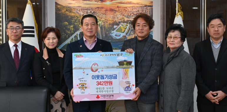 [경북도민방송=손중모 기자]대구 남구청은 대명3동 뉴타운 재개발사업 조합이 지난해 12월 30일 연말을 맞아 지역 내 어려운 이웃을 위해 써달라며 성금 342만 원을 기탁했다고 5일 밝혔다.이번 성금은 대명3동 뉴타운 재개발사업 조합 조합장 이대룡을 비롯한 임원과 대의원, 직원들이 뜻을 모아 마련한 것으로, 지역사회 나눔 실천의 의미를 더했다.조재구 남구청장은 “어려운 이웃을 위해 남구에 따뜻한 마음을 전해주신 대명3동 뉴타운 재개발사업 조합원 여러분께 감사드린다”며 “기탁된 성금은 소중한 뜻에 따라 관내 취약계층에 잘 전달하겠다”고 말했다.한편 남구는 기부된 성금을 지역 내 도움이 필요한 이웃들에게 전달해 연말연시 나눔 문화 확산에 힘쓸 계획이다.