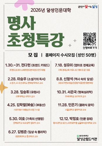 [경북도민방송=손중모 기자]대구 달성군립도서관은 2026년 한 해 동안 지역 주민들을 위한 ‘명사초청특강’을 진행한다고 8일 밝혔다. 이번 특강은 다양한 분야의 전문가들이 강연자로 나서, 문학, 역사, 경제, 행복심리학, 물리학 등 폭넓은 주제를 다룰 예정이다. 특강은 1월부터 12월까지 총 11회 진행되며, 지역 주민들에게 인문학적 소양을 증진시키는 기회를 제공할 예정이다. 첫 번째 특강은 1월 30일부터 31일까지 진행되며, ‘트렌드 코리아 2026’의 공동 저자 전다현 박사가 강연자로 나선다. 전 박사는 2026년 사회와 소비 트렌드의 변화를 분석하며, ‘호스 파워(HORSE POWER)’라는 키워드를 중심으로 다양한 사례와 데이터를 제공할 예정이다. 이를 통해 참가자들에게 미래의 트렌드를 준비하는 데 필요한 통찰을 제공할 것으로 기대된다. 이후 강연에는 ▷‘고요한 읽기’의 이승우 소설가, ▷유럽사 전문가 임승휘 교수, ▷부동산 분석가 김학렬 소장, ▷법의학 전문가 이호 교수, ▷물리학자 김범준 교수 등 각 분야를 대표하는 전문가들이 나선다. 또한, ▷가족 경제 교육 전문가 성유미 대표(깨비드림), ▷지역사 전문가 신형석 본부장(대구문화예술진흥원 박물관운영본부), ▷행복 심리학 권위자 서은국 교수, ▷클래식 음악 전문가 민은기 교수, ▷경제학자 박정호 교수 등이 강연에 참여해 심도 있는 이야기를 나눈다. 강연별로 선착순 50명을 모집하며, 참가비는 무료다. 신청은 강연일 기준 2주 전 화요일 오전 9시부터 달성군립도서관 누리집을 통해 가능하다. 최재훈 달성군수는 “다양한 주제로 최고의 전문가를 모시고 진행하는 명사 초청 특강에 많은 관심과 참여를 바란다”며, “앞으로도 지역 주민에게 양질의 지식과 정보를 전달하는 달성군이 되도록 노력하겠다”고 말했다.