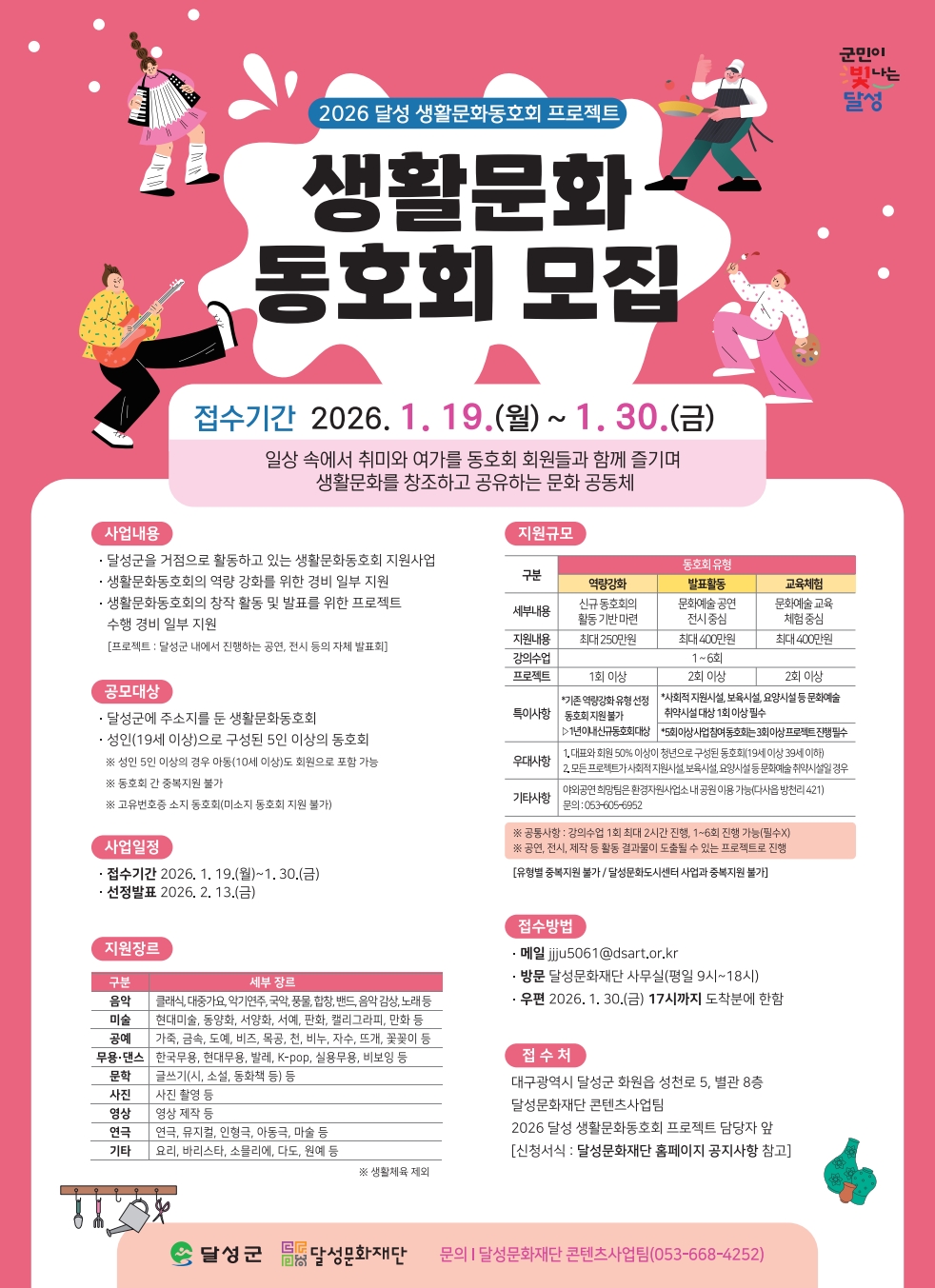 이번 사업은 주민들이 일상 속에서 자발적으로 참여하는 문화예술 활동을 지원하기 위한 것으로, 생활체육을 제외한 음악·미술·무용·문학·사진 등 다양한 생활문화 장르를 대상으로 한다.모집 대상은 달성군에서 활동 중인 성인(만 19세 이상) 5인 이상으로 구성된 동호회이며, 선정 규모는 35팀 안팎이다.
