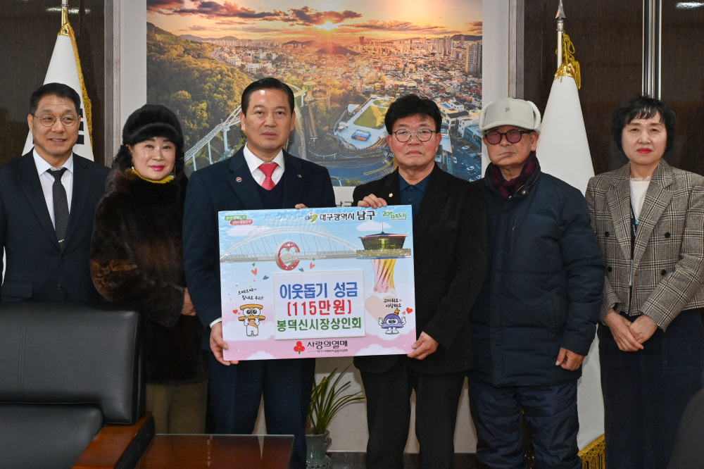 [경북도민방송=손중모기자] 대구 남구 봉덕신시장 상인들이 지역 이웃을 위한 따뜻한 나눔에 나섰다.대구 남구는 지난 7일 봉덕신시장 상인회(회장 함광식)가 이웃돕기 성금 115만 원을 기탁했다고12일 밝혔다.이번 성금은 경기 침체 등으로 어려운 여건 속에서도 상인들이 뜻을 모아 마련한 것으로, 전통시장이 지역사회와 함께하는 공동체 정신을 실천했다는 점에서 의미를 더하고 있다.함광식 봉덕신시장 상인회장은 “상인들의 작은 정성이지만 어려운 이웃들이 따뜻한 겨울을 보내는 데 보탬이 되길 바란다”며 “전통시장은 언제나 지역과 함께하며 상생의 가치를 이어가겠다”고 말했다.조재구 남구청장은 “지역 이웃을 위한 나눔을 실천해 주신 봉덕신시장 상인회에 깊이 감사드린다”며 “기탁된 성금은 소외된 주민들을 위해 소중히 사용하겠다”고 전했다.한편 봉덕신시장은 지역 대표 전통시장으로서 평소에도 다양한 나눔과 사회공헌 활동을 통해 지역사회와의 상생을 실천하고 있다.