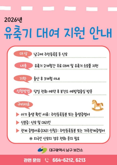 [경북도민방송=손중모 기자]대구 남구가 모유수유에 어려움을 겪는 산모를 지원하고 모유수유 친화적 환경을 조성하기 위해 2026년 유축기 대여 지원 사업을 본격 추진한다고 13일 밝혔다;모유수유는 영아의 면역력 향상과 산모의 산후 회복에 도움이 되는 중요한 수유 방식이지만, 출산 초기 유방 울혈이나 모유 부족에 대한 인식, 정보 부족 등으로 어려움을 겪는 산모가 적지 않다.