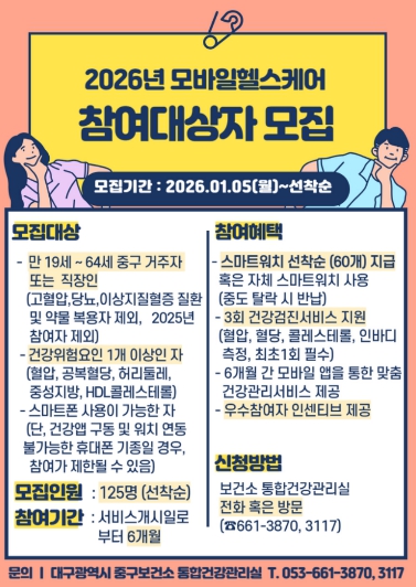 [경북도민방송=손중모 기자]대구 중구는 스마트폰과 활동량계를 활용해 개인 맞춤형 건강관리를 지원하는 ‘2026년 모바일 헬스케어 사업’ 참여자 125명을 선착순으로 모집한다. 이번 사업은 보건소 전문 인력인 코디네이터, 간호사, 영양사, 운동처방사가 참여자의 건강 상태와 생활 습관을 분석해 6개월간 비대면 건강관리 서비스를 제공하는 프로그램이다. 스마트폰 앱과 손목형 활동량계(스마트워치)를 활용해 식습관 개선과 신체활동 증진을 체계적으로 지원한다. 참여자는 사업 동안 공복혈당, 혈압, 허리둘레, 중성지방, HDL-콜레스테롤, 신체 계측, 체성분 분석 등 건강검진을 초기·중간·최종 총 3회 실시해 건강 변화 추이를 확인할 수 있으며, 이를 바탕으로 전문 상담도 함께 제공받는다. 신청 대상은 19세부터 64세까지의 중구 거주자 또는 중구에 있는 직장인으로, 혈압·공복혈당·허리둘레·중성지방·HDL-콜레스테롤 등 건강 위험 요인을 1개 이상 보유하면 우선 선정된다. 다만 고혈압, 당뇨병, 이상지질혈증 진단을 받았거나 관련 약물을 복용 중인 경우는 대상에서 제외되며, 예비 대상자 검진 결과 약물치료가 필요하다고 판단되면 최종 선정되지 않을 수 있다. 모집 인원은 총 125명이며, 이 가운데 선착순 60명에게는 활동량계가 지급된다. 사업 기간에는 랭킹 미션을 운영해 우수 참여자에게 소정의 인센티브도 제공할 예정이다. 참여를 희망하는 중구 주민과 직장인은 중구보건소 통합건강관리실로 전화하거나 방문해 신청하면 되며, 모집 인원 초과 시 조기 마감될 수 있다. 류규하 중구청장은 “모바일 헬스케어 사업은 보건소 방문이 어려운 주민들도 일상에서 건강관리를 실천할 수 있도록 돕는 프로그램”이라며 “이번 사업이 시민들의 자기 건강관리 역량을 높이고 건강한 생활 습관 형성에 도움이 되기를 바란다”고 말했다.