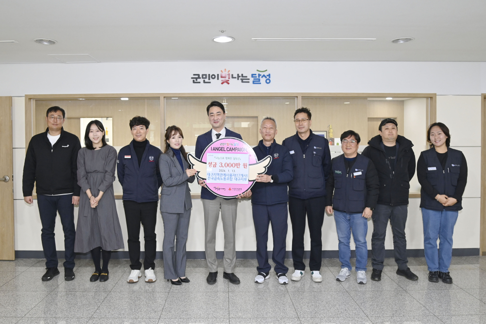 [경북도민방송=손중모기자]달성군은 대구지역 관계사용자협의회 17개사와 전국금속노동조합 대구지부가 지역 내 저소득 취약계층을 위해 성금 3천만 원을 기탁했다고 13일 밝혔다.이날 열린 기탁식에는 대구지역 관계사용자협의회 소속 17개사와 전국금속노동조합 대구지부 관계자 등 9명이 참석해 지역사회와 함께하는 나눔의 뜻을 나눴다.김성하 넥스트로 부지점장(대구지역 관계사용자협의회)과 선상한 전국금속노동조합 대구지부 수석부지부장은 “노사가 함께하는 사회공헌 활동을 지속해 지역사회에 실질적인 보탬이 될 수 있도록 노력하겠다”고 밝혔다.최재훈 달성군수는 “나눔으로 행복한 달성을 만드는 데 힘을 보태주신 대구지역 관계사용자협의회 17개사와 전국금속노동조합 대구지부에 진심으로 감사드린다”며 “기탁해 주신 성금이 도움이 필요한 이웃들에게 소중히 전달될 수 있도록 최선을 다하겠다”고 말했다.한편 대구지역 관계사용자협의회와 전국금속노동조합 대구지부는 2010년 노·사 단체협약을 통해 복지기금을 조성한 이후, 해당 기금을 활용해 지역 내 취약계층을 지원하는 사회공헌 활동을 꾸준히 이어오고 있다.