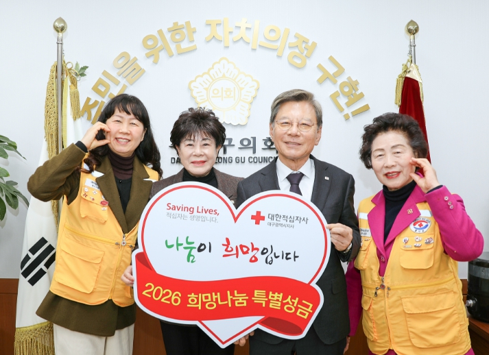 [경북도민방송=손중모 기자]대구 수성구의회는 13일 대한적십자사 대구지사에 ‘2026 희망나눔 특별성금’ 100만원을 전달했다.적십자 회비는 재난구호, 사회봉사, 취약계층 지원 등 어려움에 처한 이웃을 돕고 희망을 전하는 다양한 인도주의 사업에 사용된다.조규화 의장은 “요즘 치솟는 물가로 서민들의 경제적 어려움이 가중된 것으로 알고 있다”며 “이러한 힘든 시기에 우리의 작은 나눔이 어려운 이웃에게 도움이 되길 바라며, 앞으로도 기부문화 확산에 적극 동참하겠다”고 말했다.