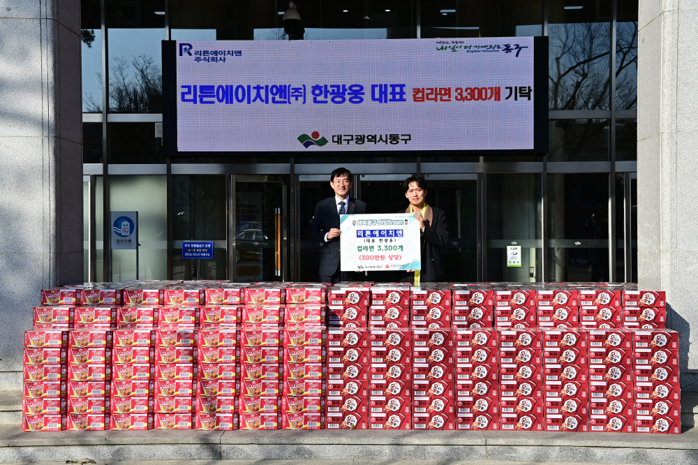 [경북도민방송=손중모기자] 리튼에이치앤㈜는 지난 13일 동구 지역 저소득 가정을 돕기 위해 컵라면 300만 원 상당을 동구청에 기탁했다고 밝혔다.이번 기탁은 겨울철 생계 부담으로 어려움을 겪고 있는 이웃들에게 도움을 전하기 위해 마련된 것으로, 전달된 물품은 관내 저소득 가정에 지원될 예정이다.한광웅 대표는 “지역 내 어려운 이웃들이 조금이나마 따뜻한 겨울을 보낼 수 있기를 바라는 마음으로 나눔을 진행하게 됐다”며 “앞으로도 지역사회와 함께하는 나눔 활동을 지속적으로 이어가겠다”고 말했다.윤석준 동구청장은 “매년 꾸준히 저소득 가정을 위해 후원해 주신 한광웅 대표께 깊은 감사를 드린다”며 “기탁해 주신 물품은 도움이 꼭 필요한 분들께 소중히 전달하겠다”고 밝혔다.한편 리튼에이치앤㈜는 의료기기와 의약품을 제조·유통하는 사회적기업으로, 매년 동구청에 컵라면을 기탁하는 등 지역사회를 위한 나눔 활동을 꾸준히 이어오고 있다.