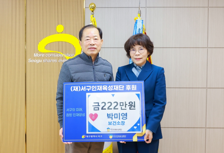 [경북도민방송=손중모 기자]대구 서구청은 보건소 박미영 보건소장이 퇴임을 앞두고 지역 인재 육성을 위해 서구 인재육성재단에 222만 원을 기탁했다고 밝혔다. 박미영 보건소장은 1992년 상주시보건소 의무과장을 시작으로 공직에 입문해, 2002년부터 2022년까지 달성군보건소장을 역임하며 지역 보건의료 발전과 주민 건강 증진에 크게 기여했다. 이후 대구광역시 서구보건소장으로 재임하며 공공보건 서비스 강화와 지역 보건 행정 발전을 이끌어 왔다. 이번 기탁금은 그동안 함께해 온 서구 지역사회에 대한 감사의 뜻으로 마련한 것으로, 지역 미래 인재 육성 사업에 사용될 예정이다.