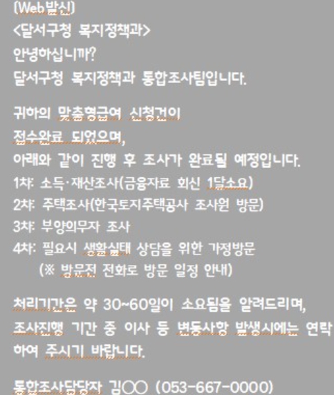 [경북도민방송=손중모 기자]대구 달서구는 맞춤형 복지급여(생계·의료·주거·교육) 신청인을 대상으로 조사 진행 상황을 안내하는 ‘알림톡 서비스’를 2026년에도 확대 시행한다. 맞춤형 복지급여는 신청인이 동 행정복지센터를 방문해 급여를 신청하면, 구청 통합조사팀이 소득·재산 및 사실 확인 조사를 거쳐 수급 여부를 결정하는 제도다. 조사 기간은 평균 30~60일이 소요돼, 신청인이 선정 결과를 기다리는 동안 절차와 진행 상황에 대한 문의가 반복적으로 발생해 왔다. 이에 달서구는 2024년부터 알림톡 서비스를 도입해, 구청 통합조사팀에서 신청 서류를 확인한 후 신청인에게 조사 담당자, 조사 기간 및 절차 등을 알림톡으로 안내하고 있다. 아울러 추가 문의에 대비해 담당자 연락처도 함께 제공함으로써 민원 편의를 높였다. 그 결과, 2024년 이후 연간 약 5,000건의 알림톡이 발송되며 복지급여 신청 절차에 대한 주민 신뢰도가 높아졌고, 조사 과정의 투명성과 체계성도 한층 강화됐다. 특히 실시간 정보 제공을 통해 신청인의 절차 이해도가 향상되면서 민원 발생률이 감소하고, 복지 서비스 전반에 대한 만족도 역시 크게 높아졌다. 이태훈 달서구청장은 “2026년에도 알림톡 서비스를 통해 맞춤형 복지급여 조사 과정을 보다 투명하고 신뢰성 있게 운영해 나가겠다”며, “주민이 체감할 수 있는 복지 행정 구현을 위해 지속적으로 노력하겠다”고 말했다.