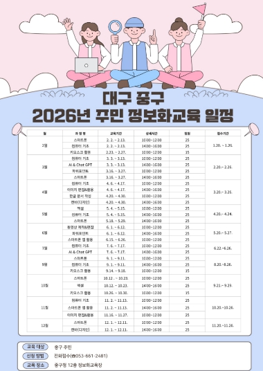 [경북도민방송=손중모 기자]대구 중구는 주민의 디지털 활용 역량을 높이고 정보 격차를 해소하기 위해 오는 2월부터 구청 12층 정보화교육장에서 ‘주민 정보화교육’을 본격 운영한다. 이번 교육은 2월부터 12월까지 진행되며(8월 휴강), 스마트폰과 컴퓨터 기초 과정부터 키오스크 활용, 동영상 제작·편집 등 총 11개 과정으로 구성된다. 특히 올해는 인공지능 기술에 관한 관심을 반영해 ‘AI & ChatGPT’ 과정과 ‘캔바(디자인)’ 과정을 새롭게 개설해, 구민들이 최신 디지털 기술을 일상에 활용할 수 있도록 지원할 계획이다. 교육은 초급·중급 수준으로 나뉘어 운영되며, 스마트폰 기본 사용법과 앱 활용, 컴퓨터 기초, 한글·엑셀·파워포인트 문서 작성, 이미지 편집, 영상 제작 등 실생활에 활용도가 높은 내용으로 편성됐다. 정보화 교육 수요를 반영해 교육 정원도 확대 운영한다. 교육 신청은 중구 주민이면 누구나 가능하며, 매달 20일(휴일인 경우 다음날 평일) 오전 9시부터 전화 접수를 통해 선착순으로 모집한다. 세부 교육 일정과 과정별 운영 내용은 중구청 누리집(홈페이지)에서 ‘정보화교육’을 검색하면 확인할 수 있다. 류규하 중구청장은 “디지털 환경 변화에 따라 행정과 일상에서 요구되는 정보 활용 능력도 점점 높아지고 있다”며 “기초 교육부터 최신 기술까지 아우르는 주민 정보화교육을 통해 구민 누구나 디지털 환경에 능동적으로 대응할 수 있도록 지원하겠다”고 말했다.