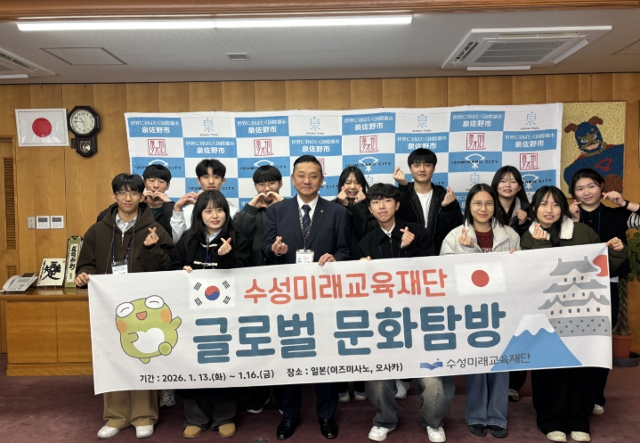 [경북도민방송=손중모 기자]대구 수성미래교육재단은 지난 13일부터 16일까지 수성구 고등학생 12명을 일본 이즈미사노시에 탐방단으로 파견해 글로벌 문화 탐방 프로그램을 운영했다고 밝혔다. 이번 탐방은 수성구와 이즈미사노시 간 우호교류도시 협정에 따라 청소년 교류 확대와 글로벌 역량 강화를 위해 마련됐으며 올해로 3년 연속 추진됐다.탐방단은 지역 고등학교의 추천을 통해 선발된 학생들로 구성됐으며, 현지 교류와 체험 활동을 통해 국제적 소통 역량을 키웠다. 학생들은 일본어로 현지인들과 직접 소통하며 국제 교류에 대한 이해와 자신감을 높였다.프로그램은 관광지 견학 위주 일정에서 벗어나 체험형으로 운영됐다. 학생들은 이즈미사노 시청을 방문해 치요마츠 히로야스 시장과 간담회를 갖고, 이즈미사노시 국제교류협회가 주관한 교류 행사에 참여해 일본 전통문화를 체험했다. 또한 오사카 부립 사노공과고등학교를 찾아 현지 학생들과 교류하고 동아리 수업을 참관했으며, 오사카 관광대학에서는 일본 유학생들과의 소통을 통해 교류의 장을 넓혔다.이번 일정에는 이즈미사노시 자치진흥과 직원 칸다 리사 씨와 다국어 지원 담당 직원 나탈리 씨가 공식 일정에 동행해 프로그램 운영과 통역을 지원했다. 칸다 리사 씨는 외국지방공무원 초청 연수 프로그램(K2H)을 통해 수성구청에서 6개월간 근무한 경력이 있어, 양 도시 간 교류의 의미를 더했다.탐방에 참여한 한 학생은 “현지 학생들과 직접 소통하며 언어의 장벽을 넘는 경험을 할 수 있었다”며 “국제 교류에 대한 시야가 넓어지는 계기가 됐다”고 말했다.김대권 이사장은 “이번 탐방이 양 도시 간 우호 협력을 강화하고 학생들의 글로벌 역량을 키우는 계기가 되길 바란다”며 “앞으로도 미래를 이끌 글로벌 인재 양성을 위한 교류 프로그램을 지속적으로 확대해 나가겠다”고 말했다.