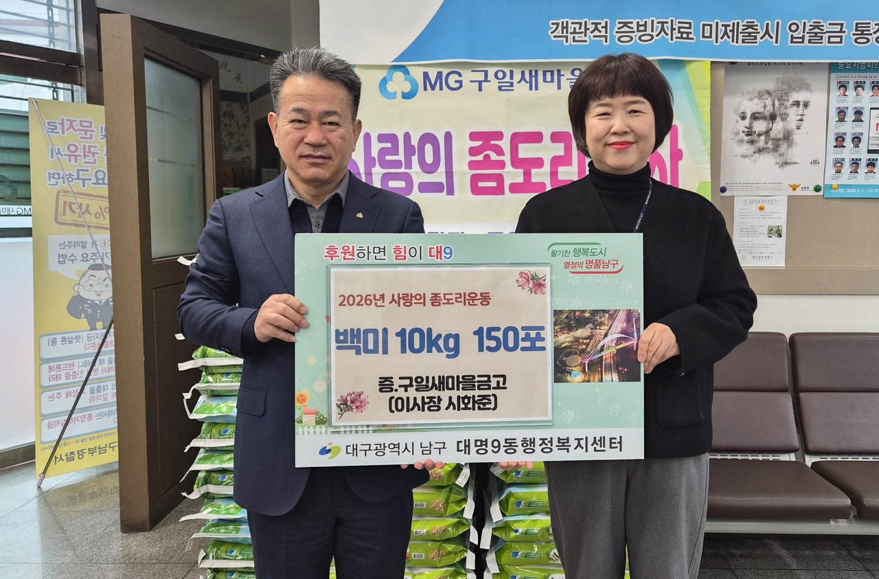 [경북도민방송=손중모기자] 대구 남구 대명9동은 구일새마을금고가 지난 21일 ‘사랑의 좀도리 운동’을 통해 모은 백미 10㎏ 150포를 관내 취약가구를 위해 기탁했다고 밝혔다.이번에 전달된 백미는 새마을금고 직원과 회원들이 조금씩 정성을 모아 마련한 것으로, 경제적 어려움으로 식생활에 부담을 겪는 취약가구에 전달될 예정이다.