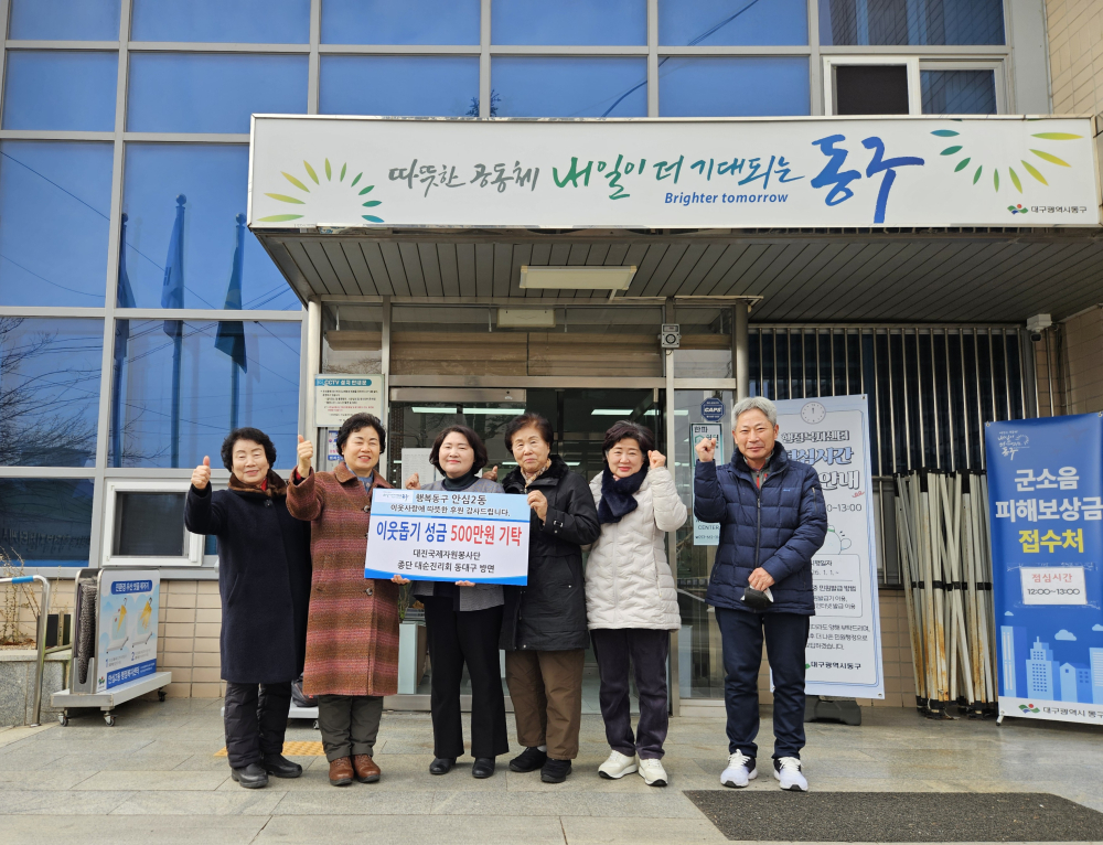 [경북도민방송=손중모기자] (사)대진국제자원봉사단 종단 대순진리회 동대구 방면 용계회관이 지역 이웃을 위한 나눔을 이어갔다.대순진리회 동대구 방면 용계회관은 지난 26일 이웃돕기 성금 500만 원을 안심2동 행정복지센터에 전달했다고 밝혔다.이번 성금은 지역 내 소외된 이웃들이 보다 따뜻하고 건강한 겨울을 보낼 수 있도록 돕기 위해 마련됐으며, 지난해에 이어 지속적으로 이어진 나눔이라는 점에서 의미를 더했다.대순진리회 관계자는 “지역사회에서 어려움을 겪는 이웃들이 희망을 잃지 않고 따뜻한 겨울을 나길 바라는 마음으로 성금을 마련했다”며 “앞으로도 도움이 필요한 이웃을 위한 나눔을 꾸준히 실천해 나가겠다”고 말했다.김경희 안심2동장은 “작년에 이어 변함없이 후원을 이어주신 데 대해 감사드린다”며 “전달된 성금은 도움이 필요한 이웃들에게 소중히 전달하겠다”고 말했다.한편 대순진리회 동대구 방면은 지역사회 나눔과 봉사 활동을 지속적으로 전개하며 이웃 사랑 실천에 앞장서고 있다.