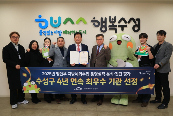[경북도민방송=손중모 기자]대구 수성구는 행정안전부가 주관한 ‘2025년 지방세외수입 운영실적 분석 진단’ 평가에서 최우수 기관으로 4년 연속 선정됐다고 밝혔다.수성구는 세외수입 징수 실적을 평가하는 정량평가와 세외수입 관리 노력을 평가하는 가점 항목 등 두 부문에서 모두 높은 점수를 받아 4년 연속 최우수 기관으로 선정됐으며, 행정안전부 장관 표창을 받았다.‘지방세외수입 운영실적 분석 진단’ 평가는 전국 243개 지방자치단체를 대상으로 세외수입 운영 실적과 관리 현황을 종합적으로 분석·평가하는 제도로, 6개 지표를 기준으로 진행됐다.김대권 수성구청장은 “지방세외수입을 체계적으로 관리하고 적극적으로 운영해 지방세와 함께 수성구의 자주재원을 안정적으로 확보할 수 있도록 최선을 다하겠다”고 말했다.
