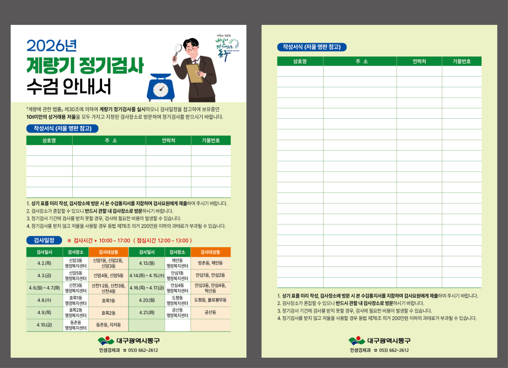 [경북도민방송=손중모기자] 대구 동구가 2026년 상거래용 저울 정기검사를 앞두고 사전 수요조사에 나선다.대구 동구청은 2월부터 3월까지 관내 각 행정복지센터를 통해 계량기(저울) 정기검사 대상에 대한 사전 수요조사를 실시한 뒤, 이를 바탕으로 4월부터 본격적인 검사를 시행할 계획이라고2일 밝혔다.이번 정기검사는 ‘계량에 관한 법률’에 따라 2년마다 실시되는 법정 검사로, 검사 대상은 10톤 미만의 상거래용 저울이다.