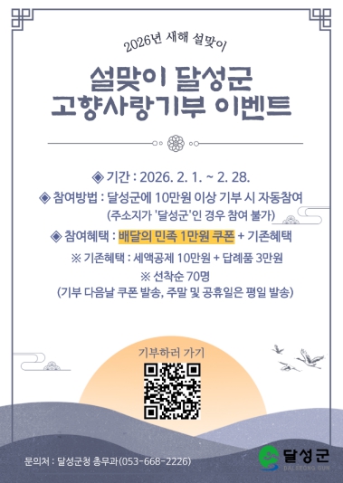 [경북도민방송=손중모 기자]달성군은 설 명절을 맞아 2월 한 달간 ‘설맞이 고향사랑기부제 특별 이벤트’를 진행한다고 2일 밝혔다.이번 이벤트는 2026년 첫 명절을 앞두고 고향사랑기부제 참여를 확대하고 기부 문화를 확산하기 위해 마련됐다.