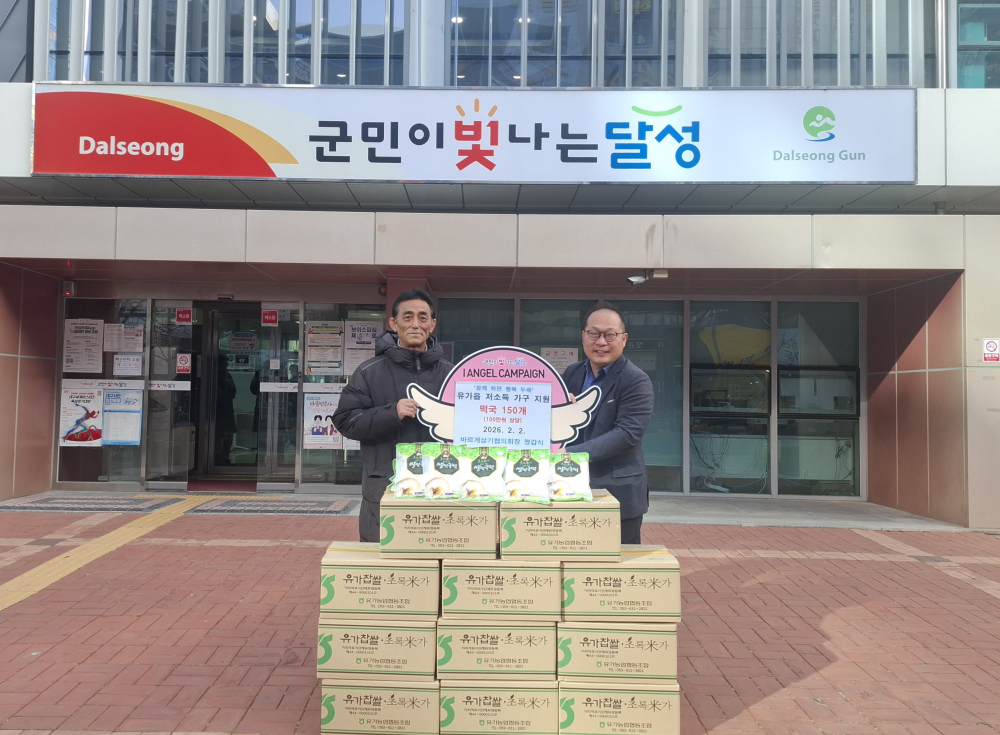 [경북도민방송=손중모기자] 달성군 유가읍 바르게살기협의회의 정갑식 회장이 생활이 어려운 저소득층 가구를 위해 떡국(700g) 150개, 100만 원 상당을 유가읍 행정복지센터에 기부했다고 2일 밝혔다.유가읍 바르게살기협의회는 재난·안전 캠페인과 기초질서 확립 활동 등 지역사회의 건강한 변화를 이끌어 온 단체로, 이웃을 위한 나눔 활동도 꾸준히 이어오고 있다.