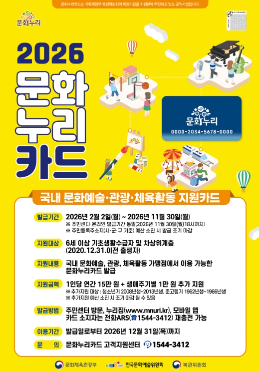 [경북도민방송=손중모 기자] 대구 동구청(구청장 윤석준)은 문화소외계층의 문화생활 향유를 지원하기 위한 통합문화이용권(문화누리카드) 신청을 지난 2일부터 11월까지 받고 있다. 문화누리카드는 6세 이상(2020.12.31. 이전 출생자) 기초생활수급자 및 차상위계층을 대상으로 문화․예술․관광․체육활동 가맹점에서 사용할 수 있는 카드를 지원하는 사업이다. 올해는 지난해에 비해 1만원 인상된 1인당 15만원을 지원하며, 생애주기별 청소년기(2008년~2013년 출생자), 준고령기(1962년~1966년 출생자)에 해당하는 연령에는 1만원을 추가 지원한다. 한편, 지난해 발급자 중 3만 원 이상 사용 이력이 있고 자격 검증기간 동안 수급자격을 유지하는 등 제외 사유에 해당하지 않는 대상자는 자동 재충전이 된다. 문화누리카드 신청기간은 2월 2일부터 11월 30일까지이며, 행정복지센터 방문 신청 또는 문화누리카드 홈페이지와 과` 모바일 앱을 통해 신청할 수 있다. 사용기간은 발급일로부터 12월 31일까지 사용 가능하다. 윤석준 동구청장은 “문화누리카드 사업을 적극적으로 홍보하여, 동구 구민 모두가 일상에서 문화 혜택을 누릴 수 있도록 노력하겠다”고 말했다.