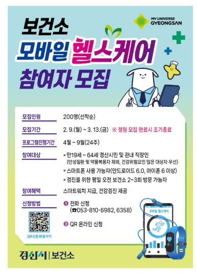 [경북도민방송=이종환 기자]경산시가 정보통신기술(ICT)을 활용해 시민의 생활 습관 개선을 돕는 ‘2026년 모바일 헬스케어 사업’ 참여자 200명을 오는 9일부터 모집한다고 4일 밝혔다.모바일 헬스케어 사업은 스마트폰 전용 애플리케이션(APP)을 통해 보건소 전문 인력이 시민의 건강 상태를 지속적으로 모니터링하고 맞춤형 상담을 제공하는 비대면 건강관리 프로그램이다.