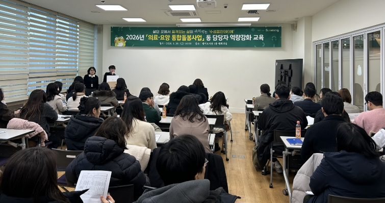 [경북도민방송=손중모 기자]대구 수성구는 지난달 30일 동 행정복지센터 찾아가는복지전담팀장과 담당자를 대상으로‘의료·요양 통합돌봄(약칭 통합돌봄) 사업 담당자 역량 강화 교육’을 실시했다고 밝혔다.이번 교육은 오는 3월 27일 전국적으로 본격 시행 예정인 통합돌봄 사업을 앞두고, 사업에 대한 이해도를 높이고 현장 실행력을 강화하기 위해 마련됐다. 교육 내용은 통합돌봄 사업의 목표와 추진 방향을 비롯해 대상자 유형별 세부 실무 절차와 각 절차에 따른 구청과 동 행정복지센터의 역할, 대상자별 사례관리 방안 등 사업 시행 이후 현장에서 바로 적용할 수 있는 실무 중심 내용으로 구성됐다.또한 수성구는 통합돌봄 사업의 핵심 가치인 ‘살던 곳에서 노후 보내기(Aging In Place)’를 중점에 두고, 살던 곳에서 품격 있는 삶이 이어지는‘수성품안(安)에’를 통합돌봄 비전으로 제시해 담당자들이 사업의 방향성과 목적을 명확히 인식할 수 있도록 안내했다.김대권 수성구청장은“통합돌봄 사업은 주민이 살고 있는 곳에서 편안한 삶을 이어갈 수 있도록 지원하는 중요한 정책”이라며, “이번 교육을 통해 현장의 대응 역량을 강화하고, 통합돌봄이 현장에서 안정적으로 안착할 수 있도록 철저히 준비해 나가겠다”고 말했다.