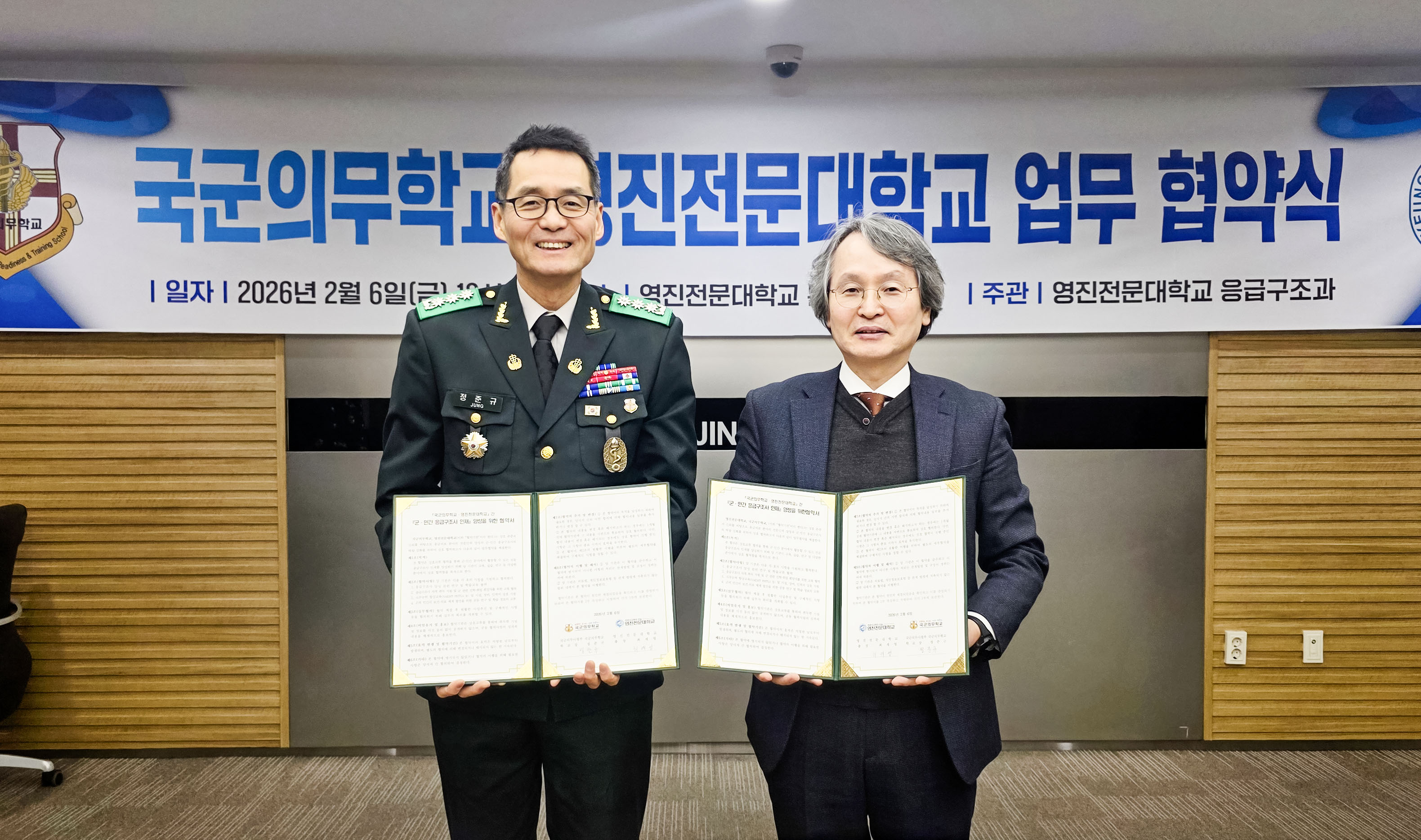 [경북도민방송=손중모기자] 영진전문대학교는 6일 오후 복현캠퍼스 본관 회의실에서 국군의무학교와 업무협약(MOU)을 체결하고, 응급의료 분야 전문 인력 양성과 군·민간 응급구조사의 실전 대응 역량 강화를 위한 협력에 나섰다.이날 협약식에는 정준규 국군의무학교장(대령)과 박대현 세이브센터장(중령)을 비롯해 박종백 영진전문대학교 부총장, 이양선 응급구조과 학과장 등 양 기관 관계자들이 참석했다.이번 협약에 따라 양 기관은 상호 존중과 신뢰를 바탕으로 군·민간 대응이 가능한 전문 응급구조사 인재를 공동 양성하고, 군 의료 역량 강화를 위해 긴밀히 협력하기로 했다.