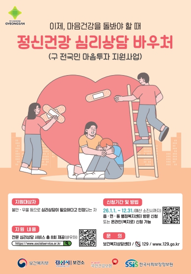 서비스 제공기관은 사회서비스 전자바우처 포털에서 확인 가능하며, 주소지와 관계없이 원하는 기관을 선택해 이용할 수 있다.경산시는 이번 사업을 통해 시민의 정신건강 문제를 조기에 예방하고 심리적 안정과 삶의 질 향상에 기여할 것으로 기대하고 있다.안병숙 경산시 보건소장은 “정서적 어려움을 겪는 시민들이 전문 심리상담을 통해 마음의 안정을 되찾고 건강한 일상으로 복귀할 수 있기를 바란다”며 “시민의 정신건강 증진을 위한 다양한 지원 정책을 지속적으로 추진해 나가겠다”고 말했다.