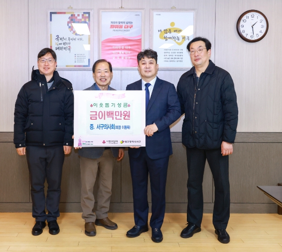 [경북도민방송=손중모 기자]대구 서구청은 지난 11일 서구 의사회(회장 이동욱)로부터 설 명절 이웃돕기 성금 200만 원을 전달받았다. 서구 의사회는 매년 명절마다 보건소 방문 건강관리 대상자들을 위해 성금을 기탁하며 꾸준한 나눔을 실천해 오고 있다. 이번 성금은 경제적 어려움을 겪고 있는 저소득 어르신과 장애인 등 방문간호 대상자들의 생계비 지원에 사용될 예정이다. 서구청은 기탁받은 성금이 필요한 대상자에게 투명하고 공정하게 전달되도록 철저히 관리할 방침이다. 이를 통해 복지 사각지대를 해소하고, 취약계층의 건강하고 안정적인 생활을 돕는 데 기여할 계획이다. 서구청 관계자는 “매년 잊지 않고 온정을 베풀어 주시는 의사회에 깊은 감사를 드린다”라며 “소외된 구민들이 따뜻한 명절을 보낼 수 있도록 실질적인 복지 증진에 최선을 다하겠다.”라고 밝혔다.