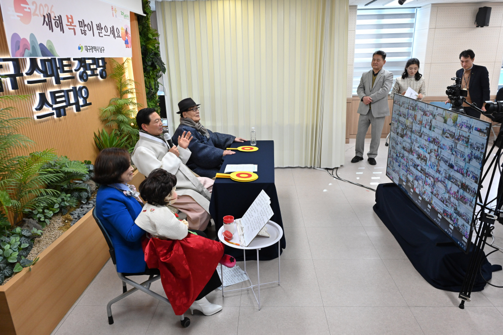 [경북도민방송=손중모기자] 대구 남구가 디지털 기술을 활용한 스마트 경로당을 통해 어르신들과 온라인으로 새해 인사를 나누며 2026년 병오년 새 출발을 알렸다.남구는 관내 경로당에 구축된 스마트 경로당 시스템을 활용해 조재구 남구청장과 임소남 대한노인회 대구 남구지회장이 함께하는 온라인 신년인사회를 개최했다.