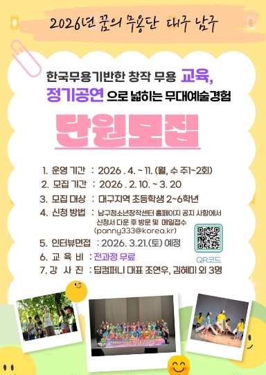 [경북도민방송=손중모 기자] 대구남구청소년창작센터가 문화예술교육 참여 기회 확대를 위해 ‘꿈의 무용단 대구 남구’ 2기 단원을 모집한다.남구는 한국문화예술교육진흥원 공모사업으로 운영되는 이번 프로그램이 아동·청소년 대상 문화예술교육 지원사업의 일환으로 추진된다고 20일 밝혔다.