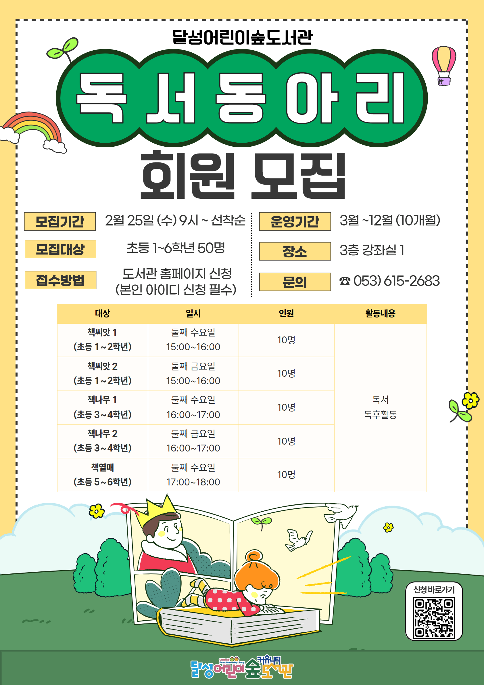 [경북도민방송=손중모기자] 달성어린이숲도서관이 어린이들의 꾸준한 독서 습관 형성과 문해력 향상을 돕기 위해 오는 25일부터 어린이 독서동아리 회원 50명을 선착순 모집한다.이번 독서동아리는 책을 매개로 또래 친구들과 생각을 나누고, 다양한 독후 활동을 통해 읽기와 쓰기의 즐거움을 경험하도록 기획된 정기 프로그램이다. `