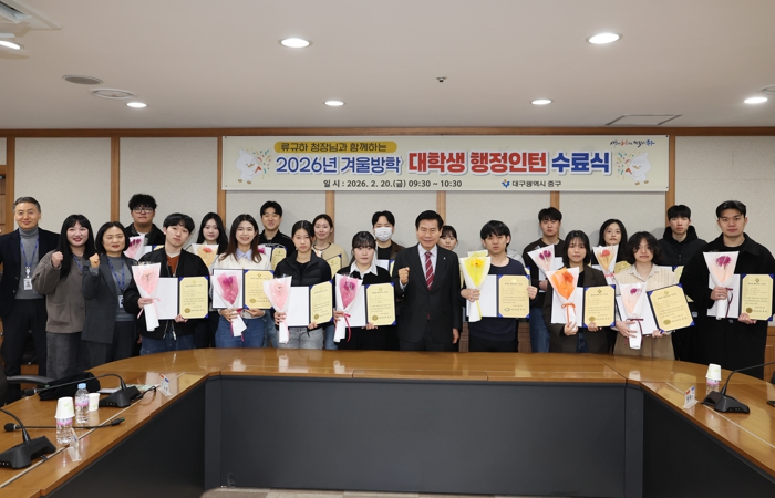 [경북도민방송=손중모 기자]대구 중구는 지난 20일 구청 상황실에서 ‘2026년 겨울방학 대학생 행정인턴 수료식’을 개최했다.이번 행정인턴 사업은 1월 12일부터 2월 20일까지 6주간 운영됐으며, 대학생 18명이 구청 각 부서에 배치돼 행정 실무를 경험했다. 수료식에는 구청장과 행정인턴 등이 참석해 수료증 수여와 함께 구정 발전 아이디어 발표 및 간담회를 진행했다.이날 대학생들은 ▲맞벌이 가구 돌봄 공백 ZERO! 예비 교사와 함께하는 징검다리 체육활동 멘토링 ▲민원인 동선 혼란 방지를 위한 시각 가이드 및 안내 도우미 운영 ▲푸드트럭을 활용한 페스티벌 운영 ▲주·정차 교통 단속 AI 활용 ▲동성로 일대 불법 주정차 해소 및 보행자 안전 강화 방안 등 참신한 정책 아이디어를 제안해 눈길을 끌었다. 제안된 아이디어는 소관 부서 검토를 거쳐 구정에 적극 반영할 계획이다.수료식 이후에는 북성로청년창업클러스터와 예술체험공간 아루스를 방문해 현장 견학했다. 특히 북성로청년창업클러스터에서는 공구 모양을 형상화한 ‘슈링클 키링 만들기’ 체험을 진행하며 지역 산업·문화 자원을 이해하는 시간을 가졌다.류규하 중구청장은 “짧은 기간이지만 행정 현장을 직접 경험한 시간이 앞으로의 진로 선택과 사회 진출에 소중한 밑거름이 되길 바란다”며 “참신한 아이디어가 구정 발전으로 이어질 수 있도록 적극 검토하겠다”고 말했다.