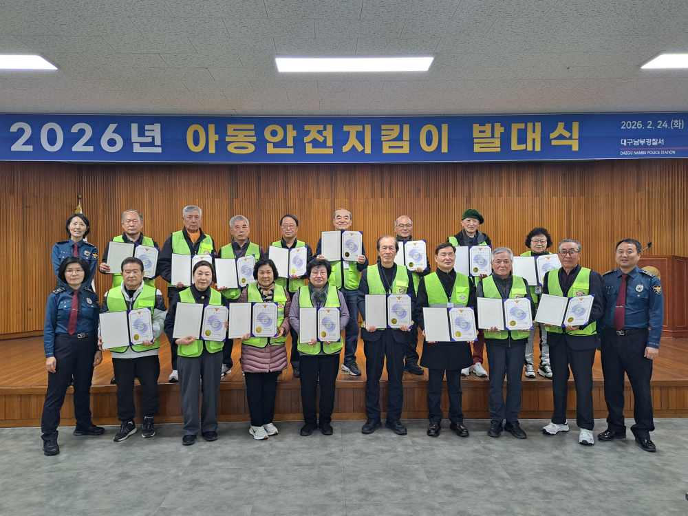 [경북도민방송=손중모기자] 대구남부경찰서는 24일 경찰서 4층 강당에서 ‘2026년 아동안전지킴이 발대식 및 직무교육’을 개최했다고 밝혔다.이날 행사에서는 공정한 선발 절차를 거쳐 최종 선발된 아동안전지킴이 16명이 참여해 향후 활동 계획을 공유하고 현장 대응 역량 강화를 위한 교육을 받았다.올해 아동안전지킴이는 서류심사와 체력검사, 면접 등을 통해 선발됐으며, 오는 3월 3일부터 12월 31일까지 남구 지역 8개 초등학교 주변 통학로와 놀이터 등 범죄 취약지역을 중심으로 순찰 활동을 수행한다.