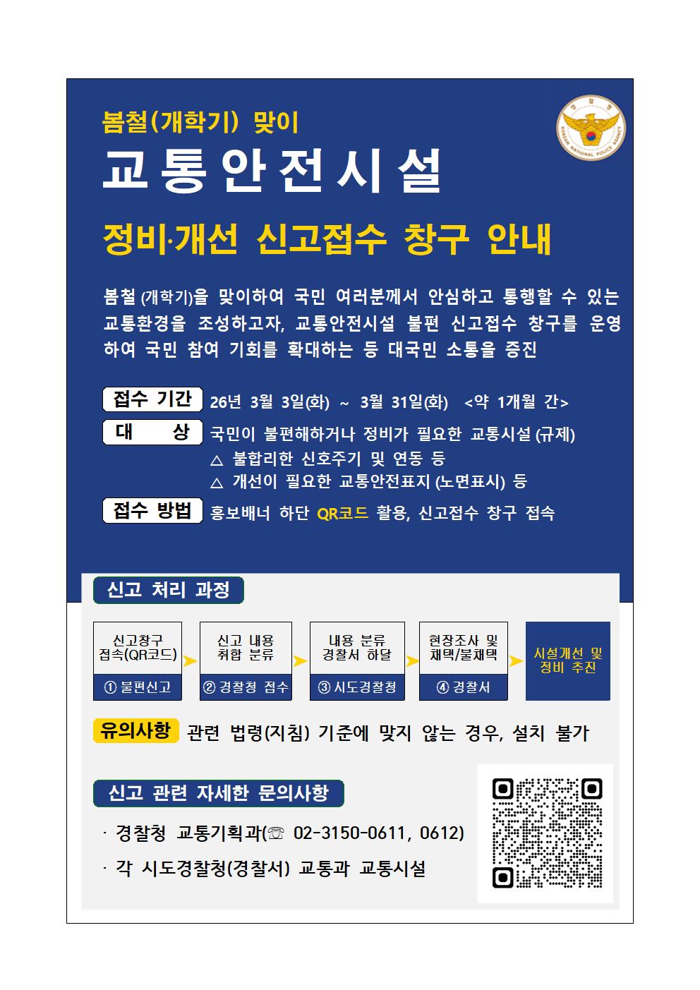 신고 대상은 도로 이용에 불편을 주거나 개선이 필요한 모든 교통안전시설로, △어린이 보호구역 개선 △불합리한 신호체계 조정 △노면표시 재도색 등 교통안전 전반을 포함한다.신고는 대구경찰청 홈페이지(www.dgpolice.go.kr) 또는 각 경찰서 홈페이지에 게시된 QR코드를 통해 간편하게 접수할 수 있다.