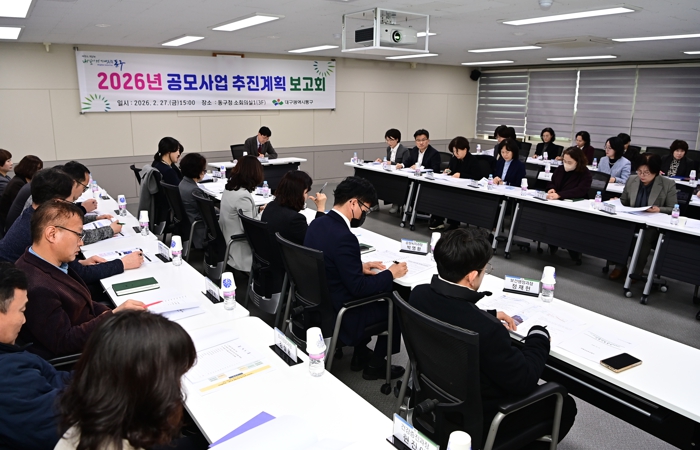 [경북도민방송=손중모 기자]대구 동구청은 지난 2월 27일, 국‧시비 발굴을 통한 민선8기 주요사업 추진동력을 확보하기 위해 ‘2026년 공모사업 추진계획 보고회’를 개최했다.이날 보고회는 2026년 정부 예산 방향에 대해 공유하고, 부서별 중점적으로 추진할 정부 공모사업에 대한 추진계획과 대응 전략을 논의했다.올해 신규 공모사업은 ‘2026년 청년성장 프로젝트 사업’, ‘하늘길 90년’, ‘동촌 하늘마을 다시 그리기’, ‘2027년 학교 밖 청소년 전용 공간 사업’ 등 지역 현안에 맞는 25개 사업을 발굴했으며, 체계적인 검토와 부서별 추진계획 공유를 통해 전략적인 국‧시비 확보에 행정력을 집중할 계획이다.윤석준 동구청장은 “제한된 지방재정 여건 속에서 실질적인 지역발전을 이루기 위해서는 국‧시비 확보가 무엇보다 중요한 상황”이라며 “적극적인 공모사업 응모를 통해 주민 삶의 질 향상에 도움이 되는 사업이 선정될 수 있도록 최선을 다해달라”고 강조했다.