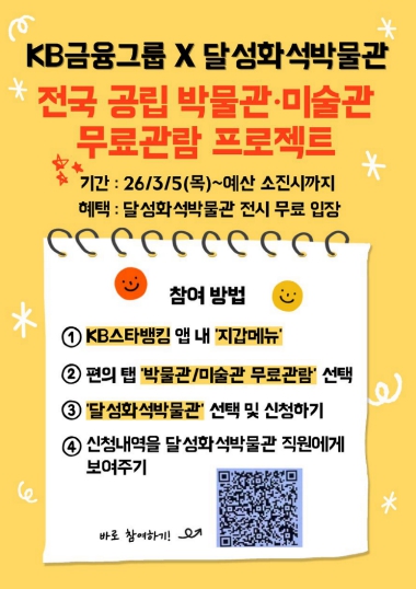 [경북도민방송=손중모 기자]달성화석박물관이 문화체육관광부와 KB국민은행, 한국박물관협회가 공동 추진하는 ‘KB×전국 공립 박물관·미술관 무료 관람 프로젝트’에 최종 선정됐다고 3일 밝혔다.이번 사업은 문화 접근성 격차를 해소하고 국민의 문화 향유 기회를 넓히기 위해 마련된 공익 프로젝트다.