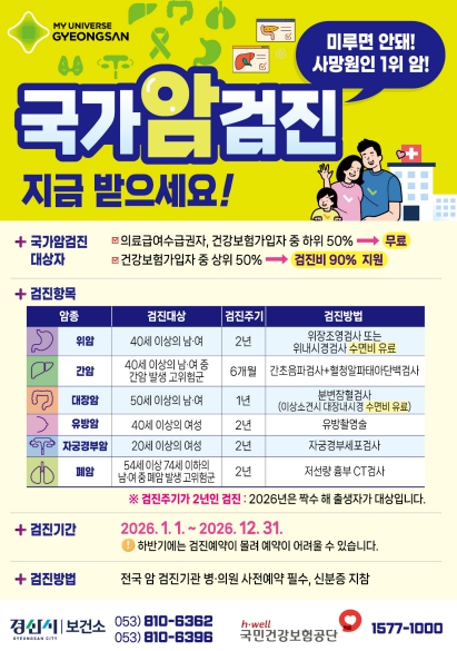 특히 대장암 발생률은 전국 평균(58.7명)보다 높은 수준으로, 정기적인 국가 암검진을 통한 조기 발견의 중요성이 강조되고 있다.또 국가암검진을 통해 암 진단을 받은 의료급여 수급권자와 차상위 본인부담 경감 대상자는 의료비 지원 기준에 따라 연간 최대 300만 원의 암 치료비를 3년간 지원받을 수 있다.경산시는 시민들의 검진 참여를 높이기 위해 SNS 홍보와 시청 홈페이지 안내를 비롯해 행정복지센터 홍보물 비치, 전광판 안내, 검진 대상자 유선 및 문자 안내 등 다양한 홍보 활동을 추진하고 있다.한편 매년 전체 수검자의 약 40% 이상이 10월 이후 연말에 검진을 받는 경향이 있어 이 시기에는 예약이 어려워지고 대기 시간이 길어지는 불편이 발생하고 있다.안병숙 경산시 보건소장은 “비교적 여유로운 상반기에 검진을 받으면 쾌적한 환경에서 충분한 상담과 검사를 받을 수 있다”며 “시민들께서 건강검진을 통해 자신의 건강 상태를 조기에 점검하고 질병 예방에 적극 나서길 바란다”고 말했다.