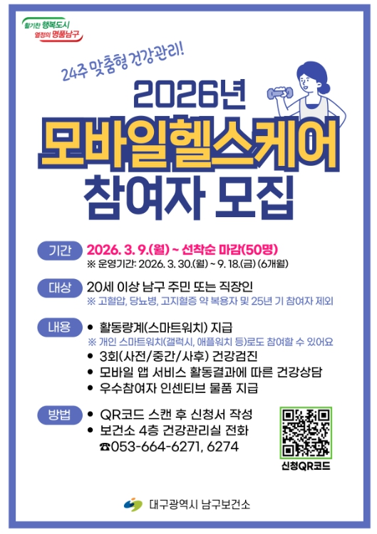 [경북도민방송=손중모 기자]대구 남구보건소는 지역주민의 효과적인 건강관리를 돕기 위해 ‘2026년 모바일 헬스케어 사업’ 신규 참여자 50명을 오는 9일부터 18일까지 모집한다.모바일 헬스케어 사업은 스마트폰 애플리케이션 ‘채움건강’과 손목형 활동량계(스마트밴드)를 활용해 간호사·영양사·운동전문가 등 전문 인력이 대상자의 생활습관을 분석하고 맞춤형 건강 상담을 제공하는 비대면·양방향 건강관리 서비스다.모집 대상은 스마트폰을 소지한 20세 이상 남구 주민 또는 관내 직장인이다.