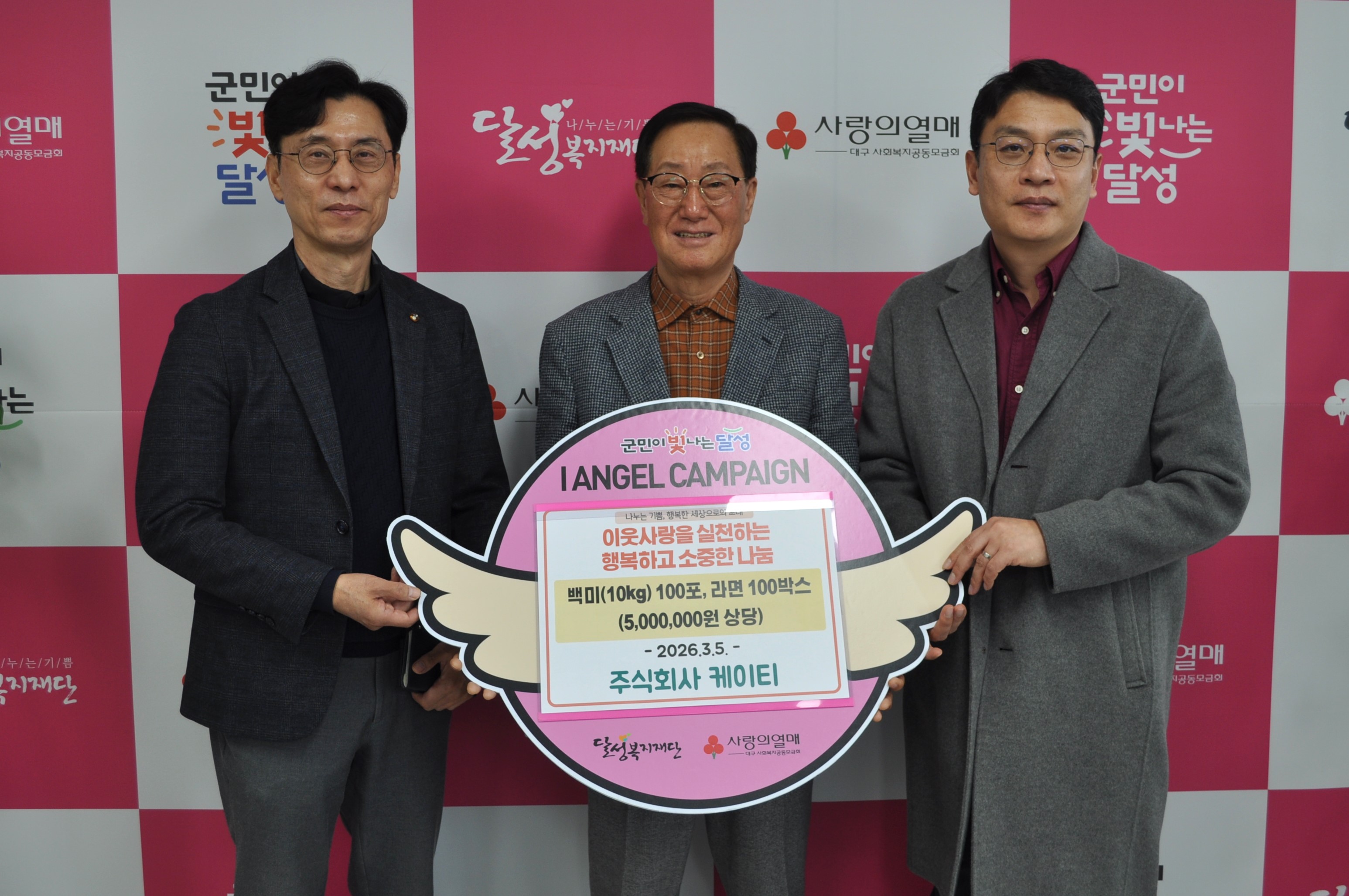 [경북도민방송=손중모기자] 달성복지재단은 지난 5일 KT가 지역 취약계층 지원을 위해 500만 원 상당의 후원물품을 기탁했다고 6일 밝혔다.이날 달성복지재단 이사장실에서 열린 기탁식에는 KT 대구경북법인고객본부 최재용 지사장과 김형수 팀장이 참석해 지역사회 나눔 활동에 동참했다.KT가 전달한 물품은 쌀 10kg 100포와 라면 100박스 등 총 500만 원 상당의 식품으로, 지역 내 도움이 필요한 취약계층에게 전달될 예정이다.송성열 달성복지재단 이사장은 “지역사회를 위한 따뜻한 나눔에 동참해 준 KT에 감사드린다”며 “기탁된 후원물품은 도움이 필요한 이웃들에게 소중히 전달하겠다”고 말했다.한편 KT는 지역사회와의 상생을 위해 다양한 사회공헌 활동을 펼치며 나눔 문화 확산에 기여하고 있다.