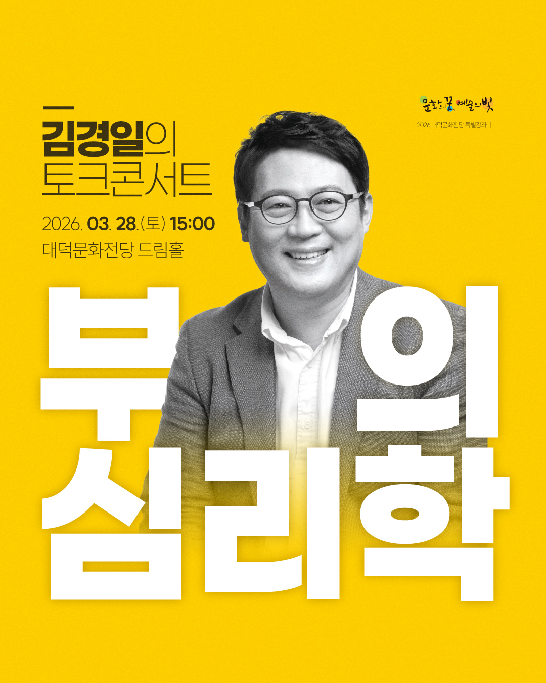 [경북도민방송=손중모기자] 대구 남구 대덕문화전당은 오는 28일 오후 3시 대한민국 대표 인지심리학자 김경일 아주대 교수를 초청해 토크콘서트 ‘부의 심리학’을 개최한다고 11일 밝혔다.이번 행사는 대덕문화전당 문화예술아카데미 특별강좌로 마련됐으며 경제학적 관점에서의 ‘부(富)’를 넘어 돈의 속성과 인간 심리를 심리학적으로 풀어보는 인문학 강연으로 진행된다.김 교수는 아주대학교 심리학과 교수로 ‘나의 두 번째 교과서’, ‘어쩌다 어른’ 등 방송 출연과 다양한 강연, 저서를 통해 대중과 활발히 소통하고 있는 인지심리학 분야 전문가다.