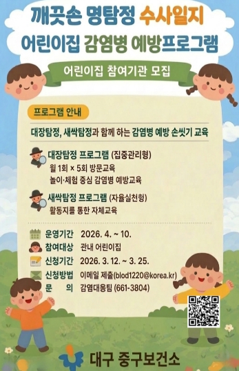 [경북도민방송=손중모 기자] 대구 중구보건소(소장 황석선)는 영유아의 올바른 손씻기 습관 형성과 감염병 예방 인식 향상을 위해 어린이집 대상 교육 프로그램 ‘깨끗손 명탐정 세균 수사일지’를 운영한다. 이번 프로그램은 영유아 눈높이에 맞춘 체험형 교육으로, 아이들이 ‘세균을 찾는 수사 활동’을 통해 올바른 손씻기 방법을 배우고 감염병 예방 수칙을 자연스럽게 익힐 수 있도록 구성했다. 교육 내용은 ▲손씻기 체험 교육 ▲세균 관찰 ▲놀이·체험형 활동 ▲가정 연계 감염병 예방 활동 등으로 구성되며, 어린이집과 가정이 함께 참여하는 방식으로 운영된다. 중구보건소는 현재 관내 어린이집을 대상으로 참여 기관을 모집하고 있으며, 신청을 희망하는 기관은 3월 25일까지 이메일로 접수하면 된다. 황석선 보건소장은 “어린이집과 가정이 함께 참여하는 감염병 예방 교육을 통해 영유아의 건강한 생활 습관 형성에 도움이 될 것으로 기대한다”며 “많은 어린이집의 적극적인 참여를 당부드린다”고 말했다.