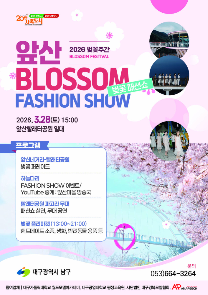 [경북도민방송=손중모기자] 대구 남구청이 벚꽃 개화 시기에 맞춰 지역 대표 관광지인 앞산빨래터공원에서 이색 문화행사를 마련한다.남구는 오는 28일 앞산빨래터공원 특설무대와 앞산해넘이전망대, 하늘다리 일대에서 ‘벚꽃 패션쇼’ 이벤트를 개최한다고16일 밝혔다.이번 행사는 전문 모델과 시민이 함께 참여하는 패션쇼와 다양한 플리마켓을 결합한 문화 이벤트로, 지역 관광 명소를 널리 알리고 침체된 지역 상권에 활력을 불어넣기 위해 기획됐다.패션쇼에는 대구가톨릭대학교와 대구공업대학교, ㈜아나피치 학원의 시니어 모델 과정 수강생, 사단법인 대구경북모델협회 등 4개 단체에서 약 100여 명이 참여한다.