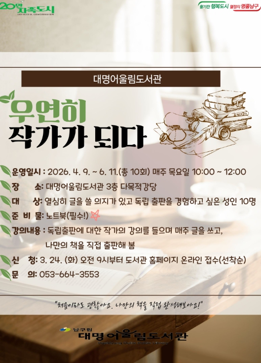 글쓰기에 관심이 있고 독립출판을 경험해 보고 싶은 성인이라면 누구나 참여할 수 있으며, 수강료는 전액 무료다.참여 신청은 3월 24일 오전 9시부터 대명어울림도서관 홈페이지를 통해 선착순으로 접수받는다.조재구 남구청장은 “이번 프로그램이 주민들에게 쉽고 흥미롭게 독립출판을 접할 수 있는 계기가 되길 바란다”며 “앞으로도 다양한 문화 향유 기회를 확대하고, 지역의 창작 기반을 넓힐 수 있는 독서·문화 콘텐츠 개발에 지속적으로 힘쓰겠다”고 밝혔다.읽는 도시를 넘어 쓰는 도시로. 남구가 주민들의 일상에 ‘작가의 경험’을 더하며 생활문화의 새로운 지평을 열고 있다.